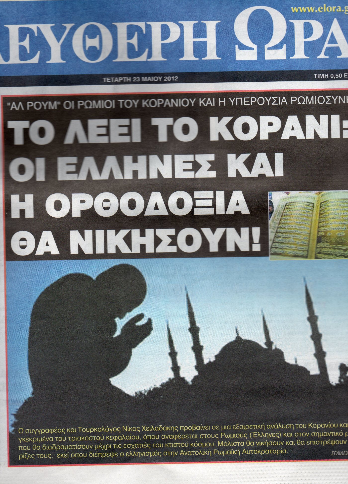 «Το λέει το Κοράνι. Οι Έλληνες και η Ορθοδοξία θα νικήσουν», είναι ο τίτλος της εφημερίδας «Ελεύθερη Ώρα» της Τέταρτης 23 Μαΐου 2012. Ο Νίκος Χειλαδάκης (συγγραφέας και Τουρκολόγος) σύμφωνα πάντα με την εφημερίδα προβαίνει σε μια «εξαιρετική» ανάλυση του Κορανίου που δήθεν αναφέρεται στους Ρωμιούς και στον ρόλο που θα παίξουν μέχρι τις εσχατιές του κόσμου. Σύμφωνα με τον κ. Χειλαδάκη θα νικήσουν και θα επιστρέψουν στην Ανατολική Ρωμαϊκή Αυτοκρατορία. Πάμε να δούμε κατά πόσο έχουμε να κάνουμε με ανάλυση (πόσο μάλλον εξαιρετική) του Κορανίου. Το άρθρο της εφημερίδας μπορείτε να το βρείτε αναδημοσιευμένο σε αρκετά χριστιανικά ιστολογία. Δεν έχετε παρά να πληκτρολογήσετε στο Google την φράση «Αλ Ρουμ» Οι Ρωμιοί του Κορανίου και η υπερούσια Ρωμιοσύνη. Το άρθρο μπορείτε να το βρείτε εδώ στο zoiforos.gr
