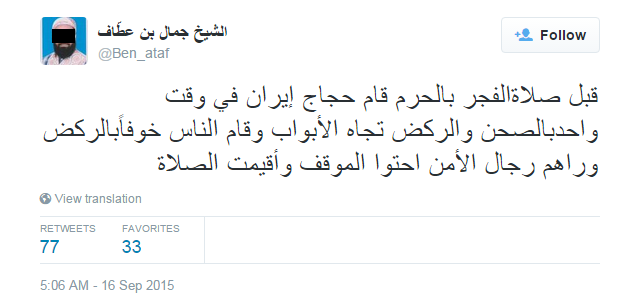 Ο σουννιτικός κόσμος γνωρίζει πολύ καλά ότι το τραγικό περιστατικό στην περιοχή Μίνα δεν είναι καθόλου αθώο και «τυχαίο». Ένας προσκυνητής 8 ημέρες πριν το συμβάν αναφέρει στο προσωπικό λογαριασμό του (τουίτερ):