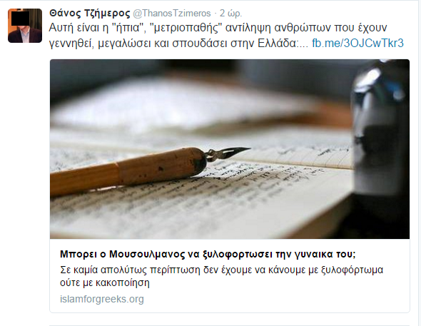 Θίχτηκε ο ακροδεξιός πολιτικός Θάνος Τζήμερος με το άρθρο στο www.IslamForGreeks.org. Συγκεκριμένα, ενοχλήθηκε με ένα άρθρο το οποίο στην ουσία επιχειρηματολογεί κατά της κακοποίησης των γυναικών από τις πηγές του Ισλάμ (δείτε εδώ το άρθρο)