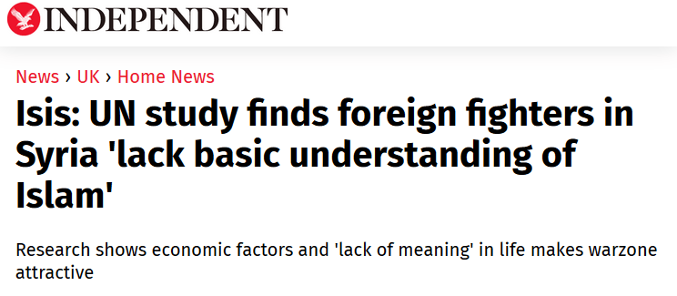 Μια μελέτη για το Γραφείο Αντιτρομοκρατίας των Ηνωμένων Εθνών διαπίστωσε ότι παρά τους ισχυρισμούς τους ότι προστατεύουν τους Μουσουλμάνους, οι περισσότεροι από τους επιστρεφόμενους μαχητές ήταν «αρχάριοι» στη θρησκεία τους και κάποιοι δεν ήξεραν πώς να προσεύχονται σωστά.
