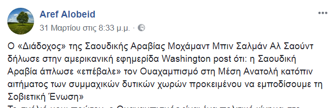«Ο «Διάδοχος» της Σαουδικής Αραβίας Μοχάμαντ Μπιν Σαλμάν Αλ Σαούντ δήλωσε στην αμερικανική εφημερίδα Washington post ότι: η Σαουδική Αραβία άπλωσε «επέβαλε» τον Ουαχαμπισμό στη Μέση Ανατολή κατόπιν αιτήματος των συμμαχικών δυτικών χωρών προκειμένου να εμποδίσουμε τη Σοβιετική Ένωση»