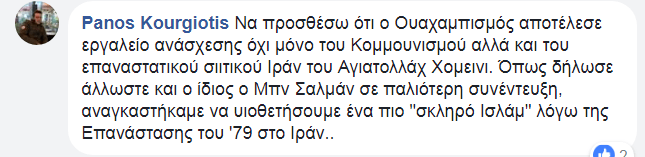 «Να προσθέσω ότι ο Ουαχαμπισμός αποτέλεσε εργαλείο ανάσχεσης όχι μόνο του Κομμουνισμού αλλά και του επαναστατικού σιιτικού Ιράν του Αγιατολλάχ Χομεινι. Όπως δήλωσε άλλωστε και ο ίδιος ο Μπν Σαλμάν σε παλιότερη συνέντευξη, αναγκαστήκαμε να υιοθετήσουμε ένα πιο «σκληρό Ισλάμ» λόγω της Επανάστασης του ’79 στο Ιράν..»