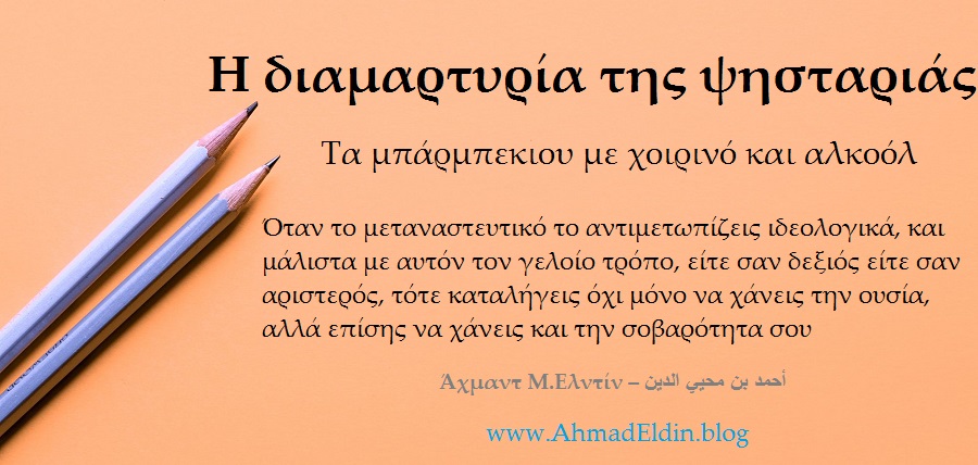 Στο AhmadEldin.blog θεωρώ ότι ο καθένας έχει δικαίωμα να εκφράζεται, αυτό όμως δεν σημαίνει ότι υιοθετώ τις απόψεις αυτές. Το κάθε σχόλιο εκφράζει τον σχολιαστή και μόνο. Παρακαλώ πολύ να είστε ευπρεπείς στις εκφράσεις σας. Σχόλια με ύβρεις, ειρωνείες, προκλήσεις, χλευασμούς, θα διαγράφονται αυτόματα