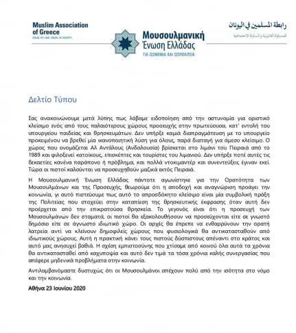 Στις 23 Ιουνίου η ψευτο Μουσουλμανική Ένωση Ελλάδος μας ενημέρωσε τα εξής σε δελτίο τύπου: