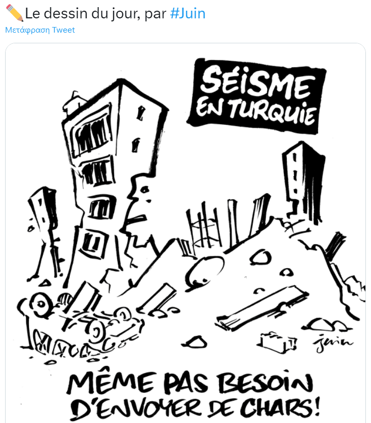 Η σατιρική και προπαγανδιστική φυλλάδα του Charlie Hebdo πανηγυρίζει με «σατιρικό» σκίτσο τον σεισμό και τους νεκρούς σε Τουρκία και Συρία.