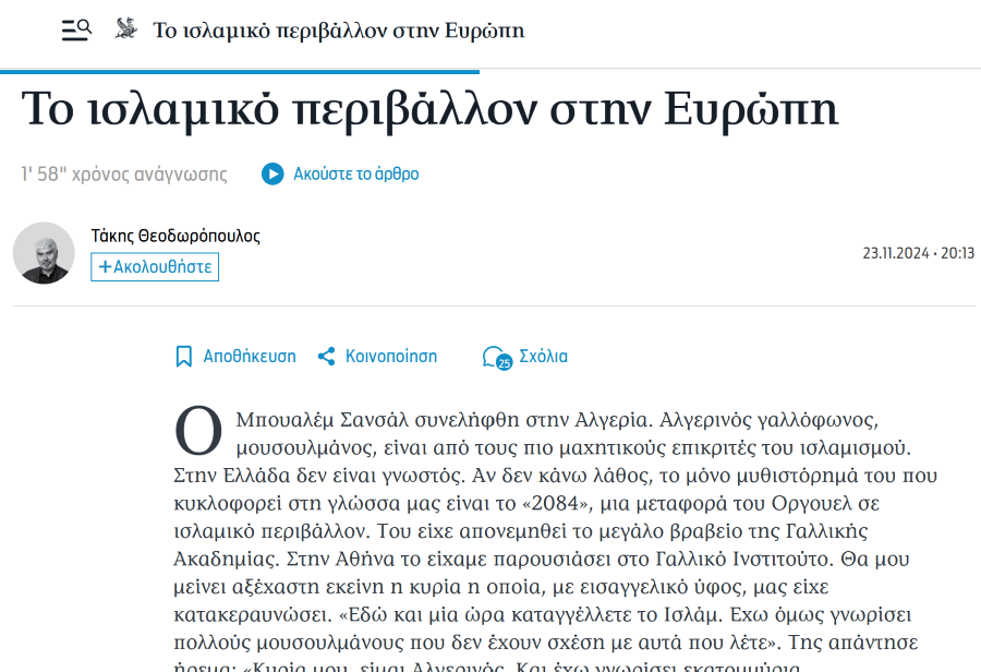 Ο Τάκης Θεοδωρόπουλος, ο «διανοούμενος», εξέφρασε σε άρθρο του στην Καθημερινή την ευαισθησία του για τη σύλληψη του Μπουαλέμ Σανσάλ, ενός Αλγερινού φιλοσιωνιστή, άθεου, γαλλόφωνου συγγραφέα, που σύμφωνα με δημοσιεύματα έχει συλληφθεί στην Αλγερία. Δηλώνει θαυμασμό για τον Σανσάλ, προφανώς επειδή ο τελευταίος στέκεται ως πολέμιος του Ισλάμ (και όχι δήθεν του «Ισλαμισμού»). Στη συνέχεια, δανειζόμενος τις θέσεις του Σανσάλ, μας λέει ότι αυτό που επιχειρούν οι «κακοί» Μουσουλμάνοι στην Ευρώπη είναι να μεταμορφώσουν «αθόρυβα» το κοινωνικό περιβάλλον. Στο βίντεο απαντάμε και αναδεικνύουμε τις αντιφάσεις του συγγραφέα.