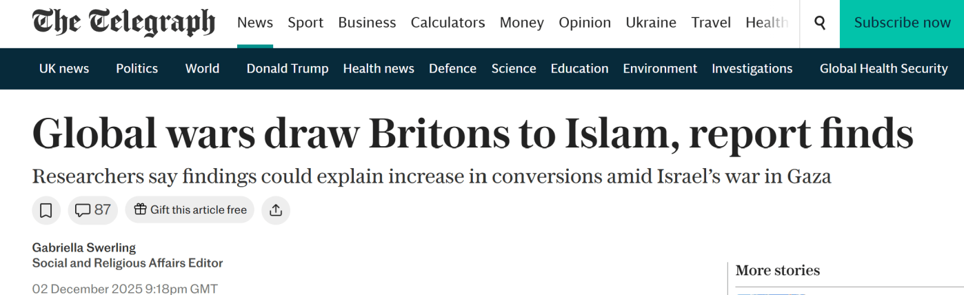 Μελέτη από βρετανικό think tank αποκάλυψε ότι ο πόλεμος του Ισραήλ στη Γάζα έχει εμπνεύσει πολλές πρόσφατες μεταστροφές στο Ισλάμ, ενισχύοντας τους ισχυρισμούς περί εντυπωσιακής αύξησης των μεταστροφών στην Ισλαμική πίστη τα τελευταία δυο χρόνια, κάτι που παρατηρείται σε όλο τον Δυτικό κόσμο και γινόμαστε μάρτυρες και εμείς εδώ στην Ελλάδα.