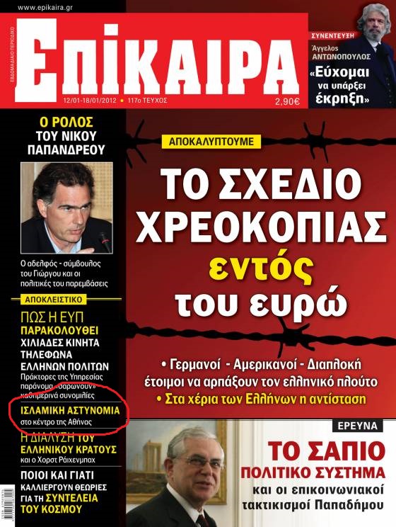 Στο περιοδικό «Επίκαιρα», τεύχος 117, και σελίδα 20 υπάρχει ένα δημοσίευμα με τίτλο «Στο έλεος της Σαρία η Αθήνα». Ο τίτλος δεν είναι μόνο υπερβολικός, δεν είναι μόνο ψευδής, αλλά με βάση όσα γράφονται υπάρχουν βάσιμες υποψίες ότι η ιστορία είναι κατασκευασμένη. Δεν είναι η πρώτη φορά άλλωστε που κατασκευάζονται διάφορα δημοσιεύματα για το Ισλάμ του στυλ «παιδάκι έκλεψε ψωμί και οι αρχές θα του κόψουν τα χεριά» η «ιστορία ενός Μουσουλμάνου που δήθεν ενοχλήθηκε στο αεροπλάνο επειδή ένας συνεπιβάτης του διάβασε την Βίβλο». Το δημοσίευμα μπορείτε να το βρείτε αναδημοσιευμένο σε διάφορα «πατριωτικά» ιστολόγια Συνέχεια ανάγνωσης «Ισλαμική Αστυνομία στο κέντρο της Αθήνας;»