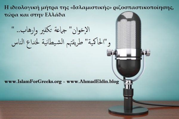 Στις 9-8-2019 έχω προγραμματίσει μια διαδικτυακή ομιλία που θα καταπιαστεί με την αποδόμηση της λεγόμενης «Ισλαμιστικής» τρομοκρατίας. Θα εξεταστούν οι ρητορικές των εξτρεμιστικών και τρομοκρατικών οργανώσεων, θα αναλυθούν υπό το φως των Ισλαμικών πηγών και θα αναιρεθούν λεπτομερειακά. Δείτε περισσότερα εδώ. Συνέχεια ανάγνωσης «Αρχίζουν να εκδηλώνονται οι «Αδελφοί Μουσουλμάνοι» στην Ελλάδα;»
